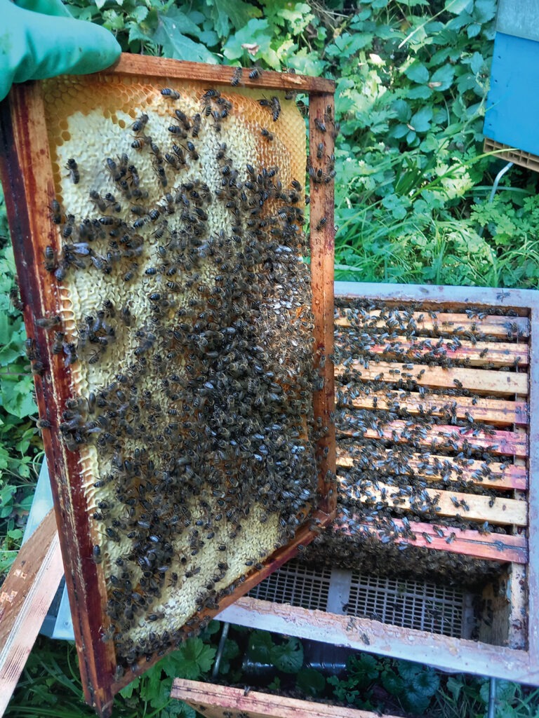 Une ruche est composée d’un corps de ruche contenant des cadres. Au centre, où il fait le plus chaud, se trouve le couvain (œufs, larves), juste à côté se trouvent des cadres renfermant du pollen qui sert à nourrir les larves et sur les cadres extérieurs se trouvent les réserves de miel qui sont toujours laissées pour la colonie.